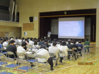 令和7年9月1日(月)に全校児童・生徒が大体育館に集まり、2学期の始業式を行いました。