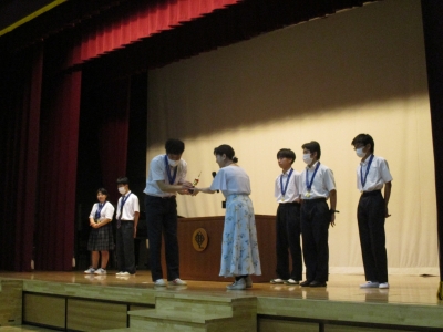 また、8月に開催された東京都障害者スポーツ大会バスケットボール大会で、本校のチームが見事優勝を果たしました。始業式では顧問から大会の報告があり、校長先生から代表生徒にトロフィーが授与されました。壇上に上がった生徒たちは少し恥ずかしそうにしながらも、とても誇らしげな様子でした。