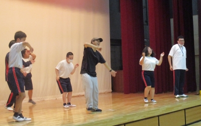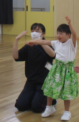 ダンス練習では、「小さな世界」の1つ1つの振りを先生に教えてもらいました。一生懸命踊りを真似ながら、音楽に合わせて踊ったり、体を動かしたりしました。最後にみんなで1曲を通して踊りました。踊り終わると、みんな自分で自分に拍手をし、「楽しかった」「最高」と言っていました。