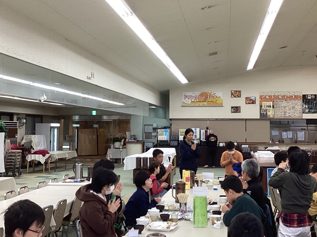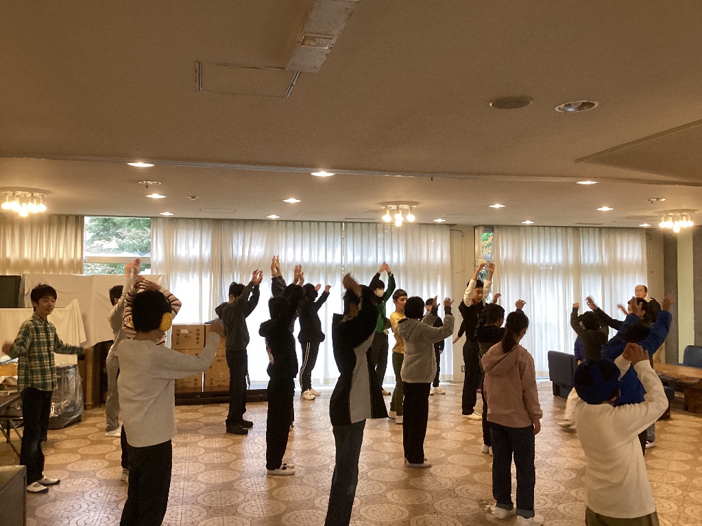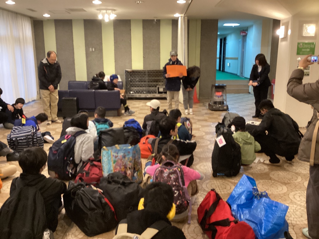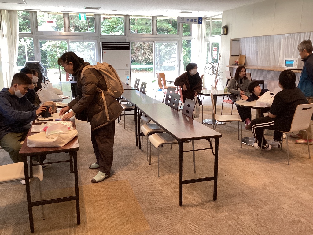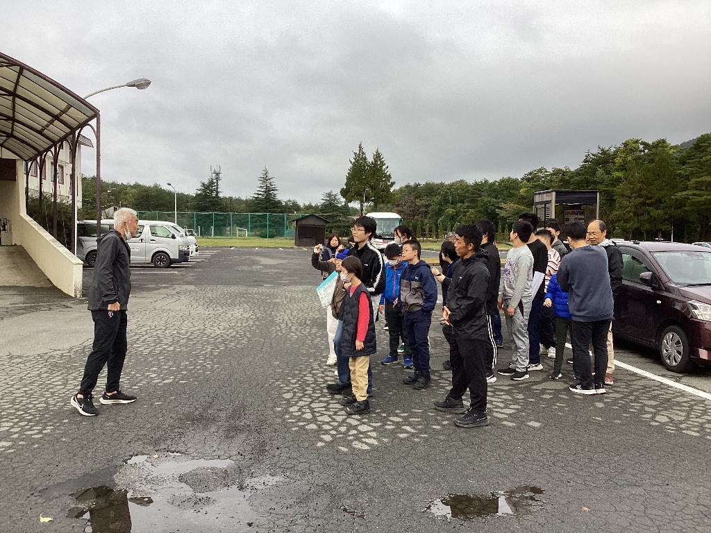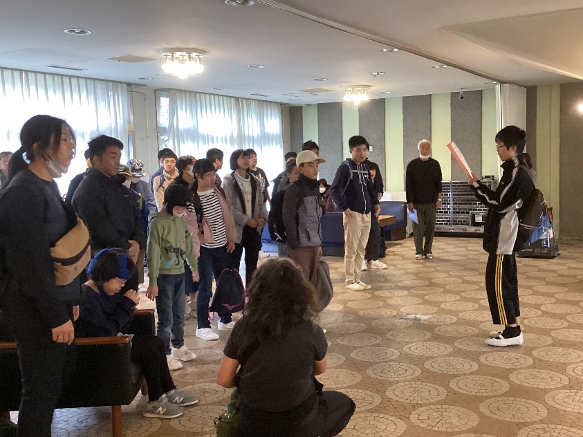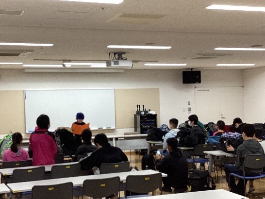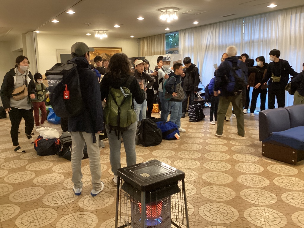 | 2025年10月22日(水) 15時20分 到着式 宿泊する「富士緑の休暇村」に着きました。 その気温は、7℃!! ロビーでは、ストーブがたかれていました。 到着式では、お世話になる宿の方に、みんなで「よろしくお願いします!」と挨拶をしました。 |