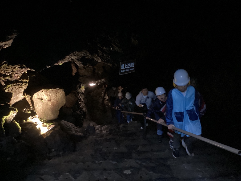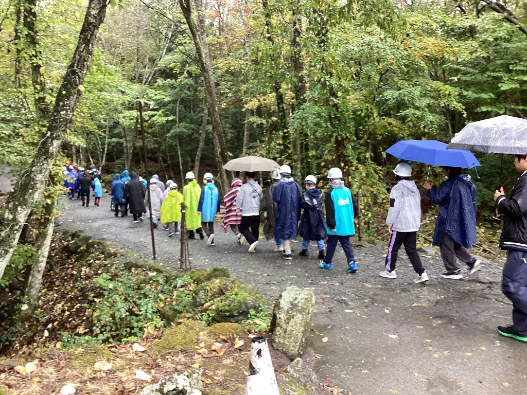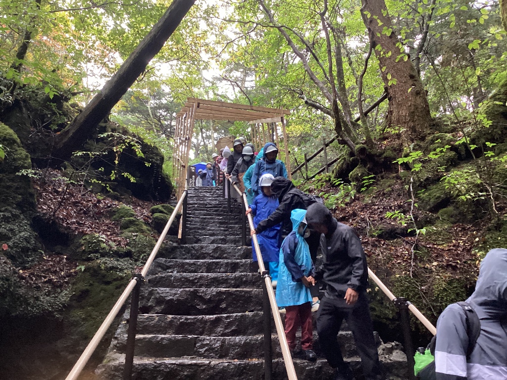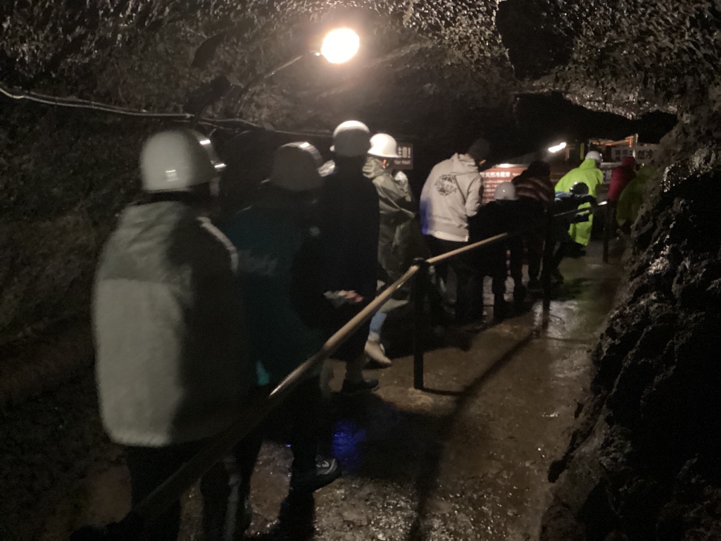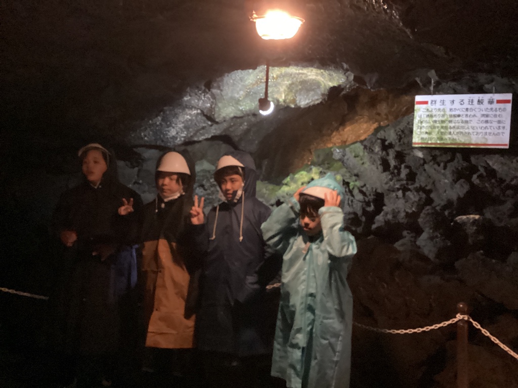 | 2025年10月22日(水) 14時30分 富岳風穴 食後は富岳風穴の見学です。 学校から持参したヘルメットを被り、「エイエイオー!」と出発しました。 風穴への入り口の階段が急で、かつ雨に濡れていたので、「こわい~」と言う声が多かったのですが、 進むにつれ、大冒険のようだと風穴の中を楽しんでいました。 滑らないように慎重に歩いたり、頭上の岩にぶつからないように 姿勢を低くして歩いたり、状況を見て進んでいました。 |