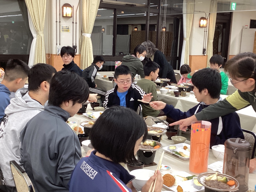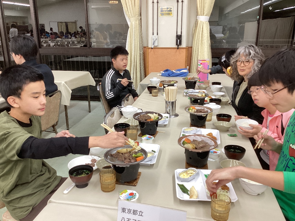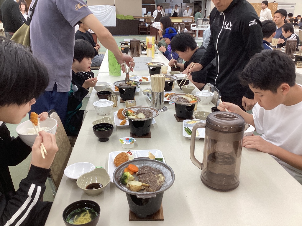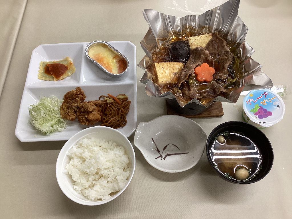 | 2025年10月22日(水) 18時30分 1日目 夕食 入浴後は、クラスでお土産の価格調査をしに売店へ行ったり、 部屋でのんびり過ごしたりしました。 18時25分、廊下に集合して食堂へ。 夕御飯のメニューは、肉豆腐、鶏のから揚げ、焼きそば、 ラビオリ、ラザニア、キャベツ、グレープゼリーです。 1時間ゆっくり時間をかけて、美味しくいただきました。 |