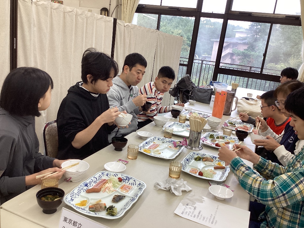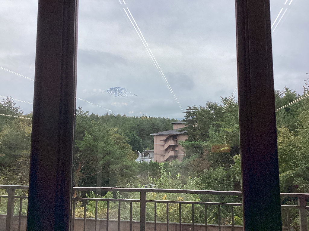 | 2025年10月23日(木) 7時30分 2日目 朝食 食堂からも富士山が見えました。 ふりかけご飯、魚、肉巻き、ウインナー、ベーコン・・・と朝からたくさん食べて、 エネルギーをおいしくチャージしました。 |