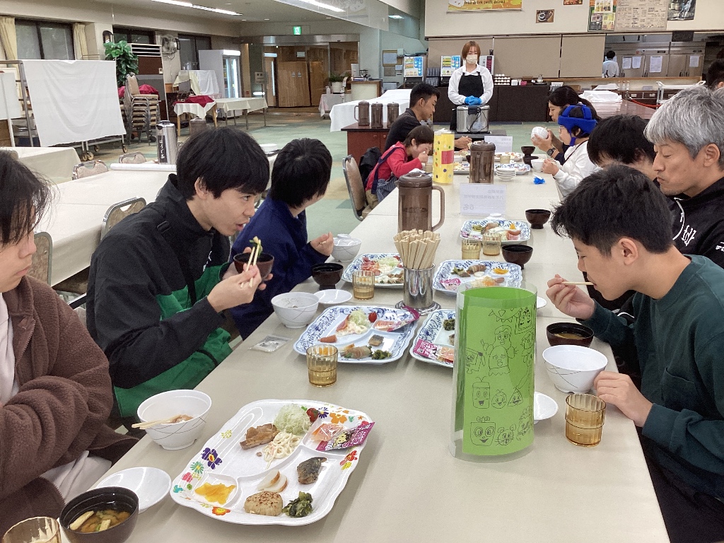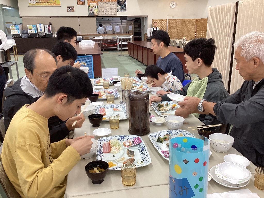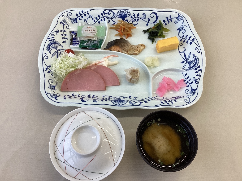 | 2025年10月24日(金) 7時30分 3日目 朝食 ラジオ体操で身体を動かし、朝食です。 シャケや玉子焼き、きんぴら、シュウマイ…、少しずつたくさん品があるメニューでした。 |