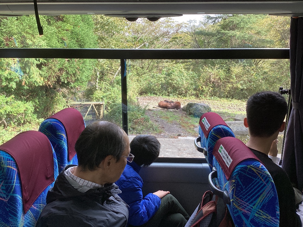 | 2025年10月23日(木) 13時00分 富士サファリパーク サファリゾーン 午後は天気も良くなり、観光バスでサファリゾーンへ。 まずは、寝ているクマがお出迎えしてくれました。 途中、道の真ん中でシマウマが立ち止まったまま動かず、 レンジャーの車が来るまで10分弱立ち往生するという、 サファリゾーンならではのハプニングもありました。 |