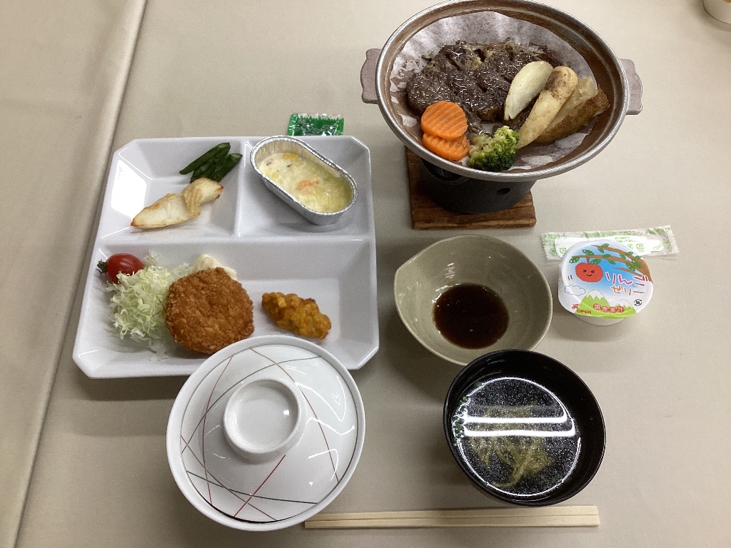 | 2025年10月23日(木) 18時30分 2日目 夕食 移動教室のメインイベント、♪富士~サファリパーク♪が終わりました。 宿に戻ってくると、富士山がとってもきれいに見えました。 入浴後は、しおりに絵を描いたり、パンフレットを貼ったりして、1日を振り返りました。 18時30分、いつも以上に時間前集合をして、食堂へ。 メニューは、エビグラタン、カニクリームコロッケ、カレイ、 そして、みんながずっと楽しみにしていた牛ステーキ!と、今日も盛りだくさんでした。 |