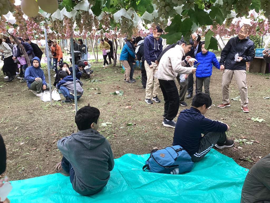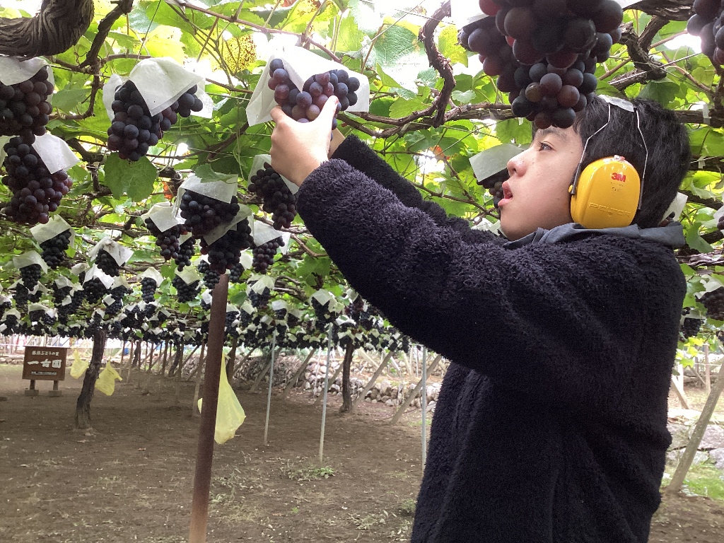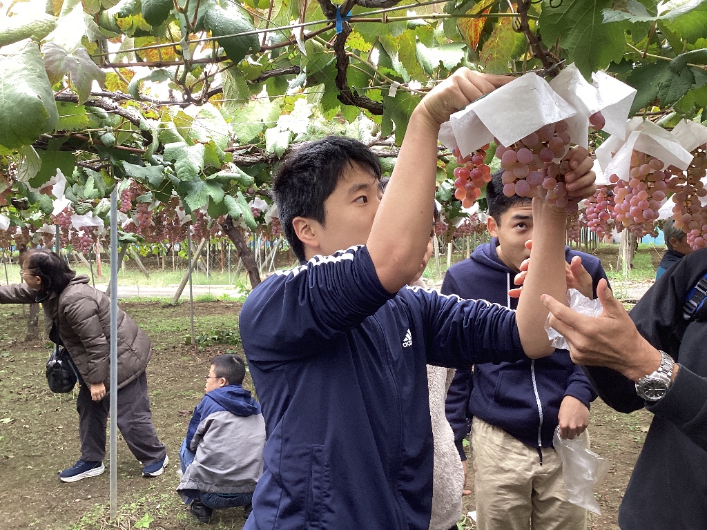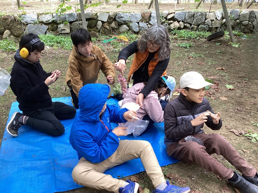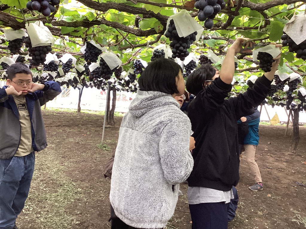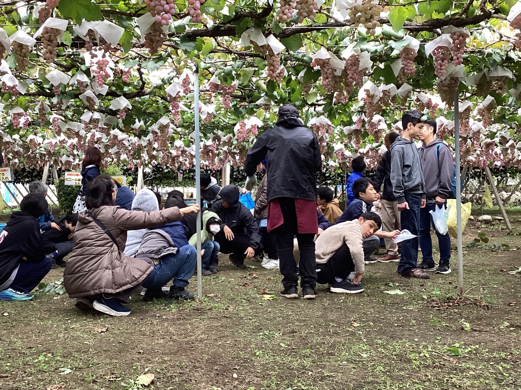 | 2025年10月24日(金) 13時40分 ぶどう狩り いよいよ最後の活動、ぶどう狩りに出発です。 富岳風穴のように、姿勢を低くして葡萄棚の下を進みました。 葡萄園の方から、手前の葡萄は甲州ぶどう、奥の黒い葡萄はベリーAという品種だと教わりました。 ハサミを入れるとずっしり重たく実っていました。 どちらも美味しくいただきました。 |