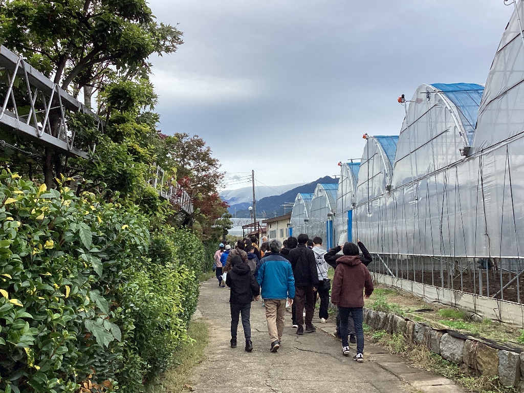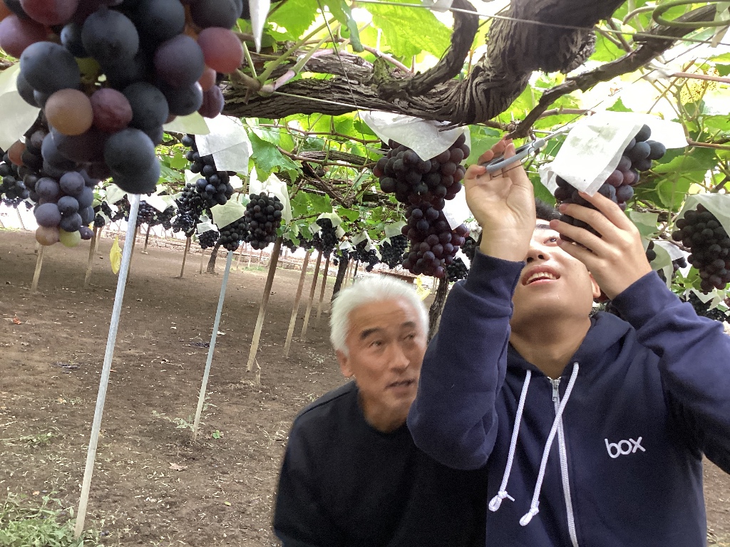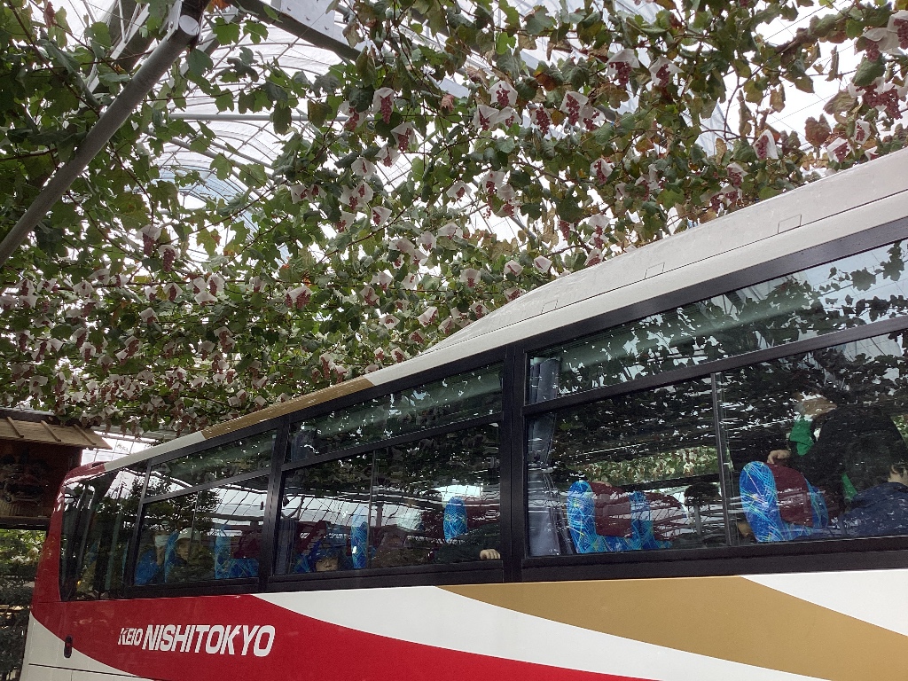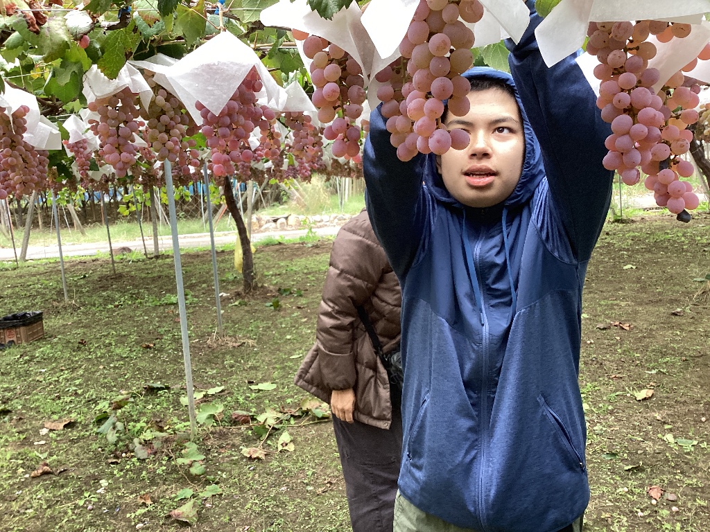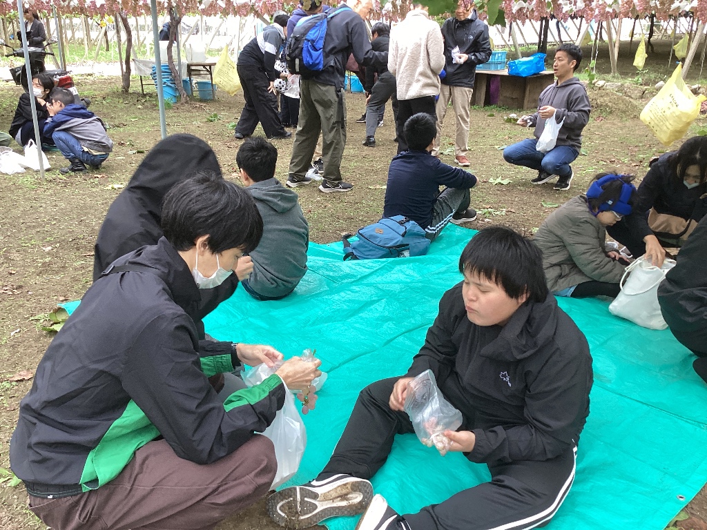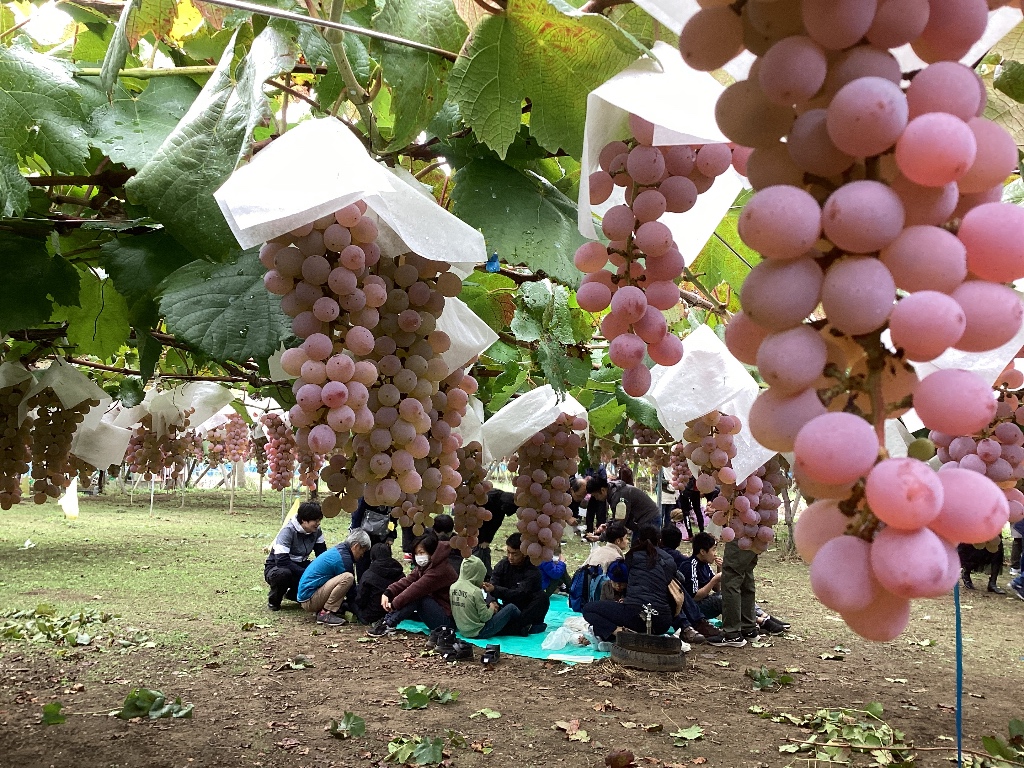 | 2025年10月24日(金) 13時40分 ぶどう狩り いよいよ最後の活動、ぶどう狩りに出発です。 富岳風穴のように、姿勢を低くして葡萄棚の下を進みました。 葡萄園の方から、手前の葡萄は甲州ぶどう、奥の黒い葡萄はベリーAという品種だと教わりました。 ハサミを入れるとずっしり重たく実っていました。 どちらも美味しくいただきました。 |