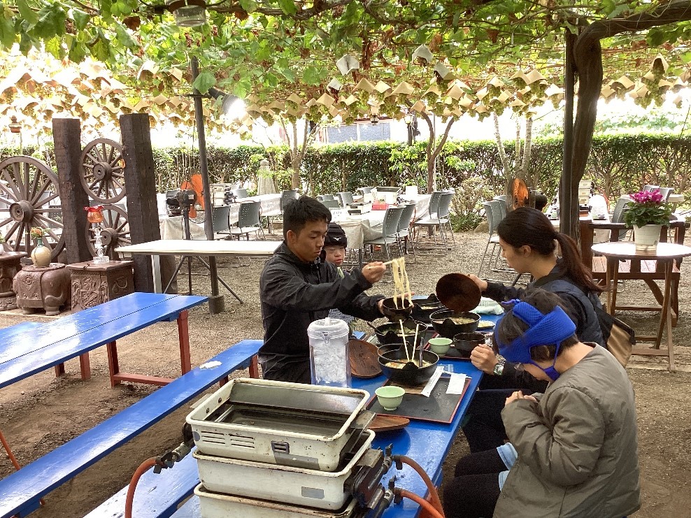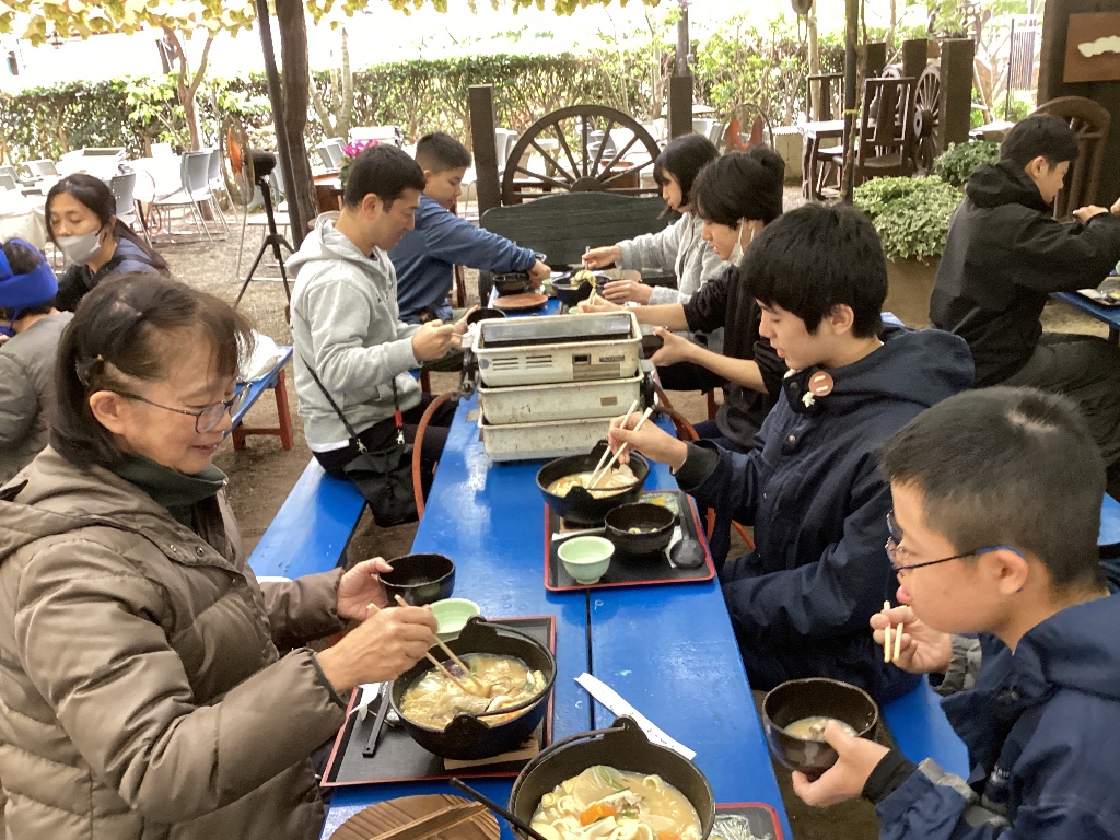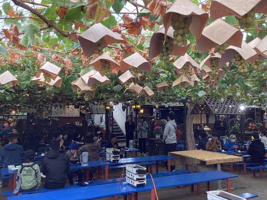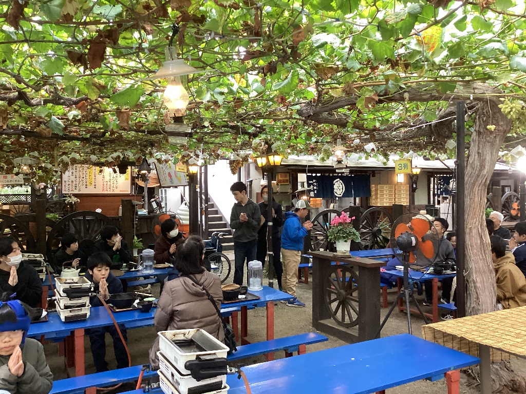 | 2025年10月24日(金) 12時30分 3日目昼食 一古園に着きました。 駐車場は葡萄棚の下で、頭上には葡萄がなっています。 山梨名物ほうとうの昼ごはんを、葡萄棚の下で食べました。 調理実習でもほうとうを作りましたが、「本場のほうとうは麺、具材が違っておいしかった。」 と感想が上がりました。 どのお鍋も空っぽでした。 |