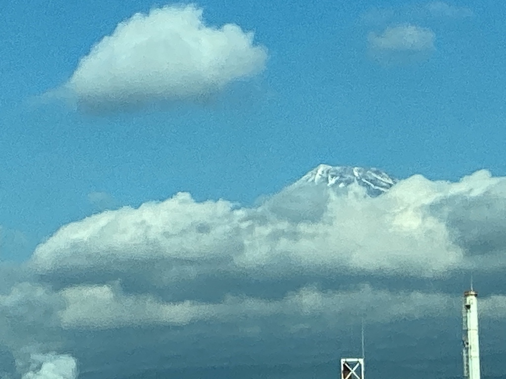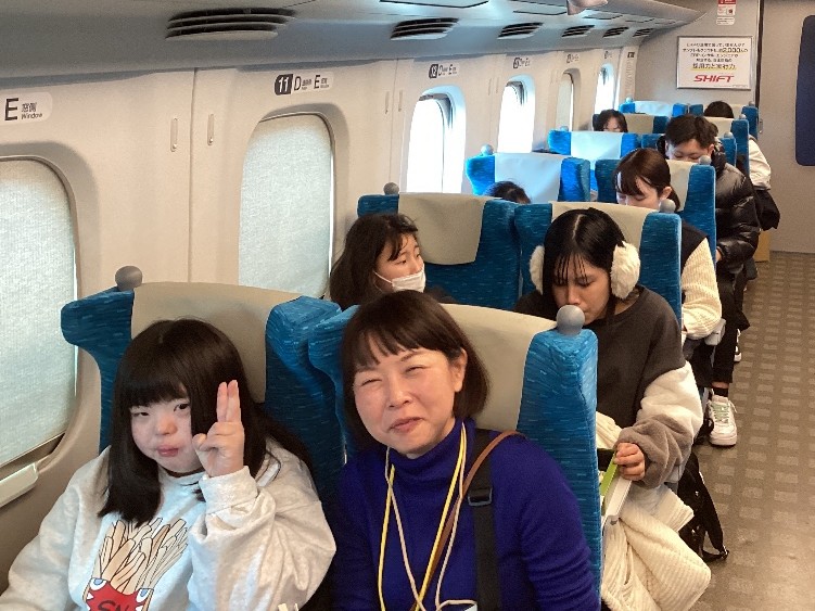 11時18分発のぞみ235号は、停車時間が1分と短いのですが、 無事に全員乗り込むことができました。 発車後、すぐに富士山が見え、みんなの気分も盛り上がっています。 |