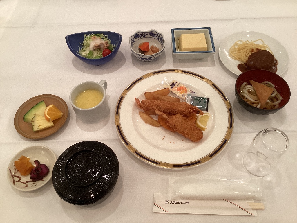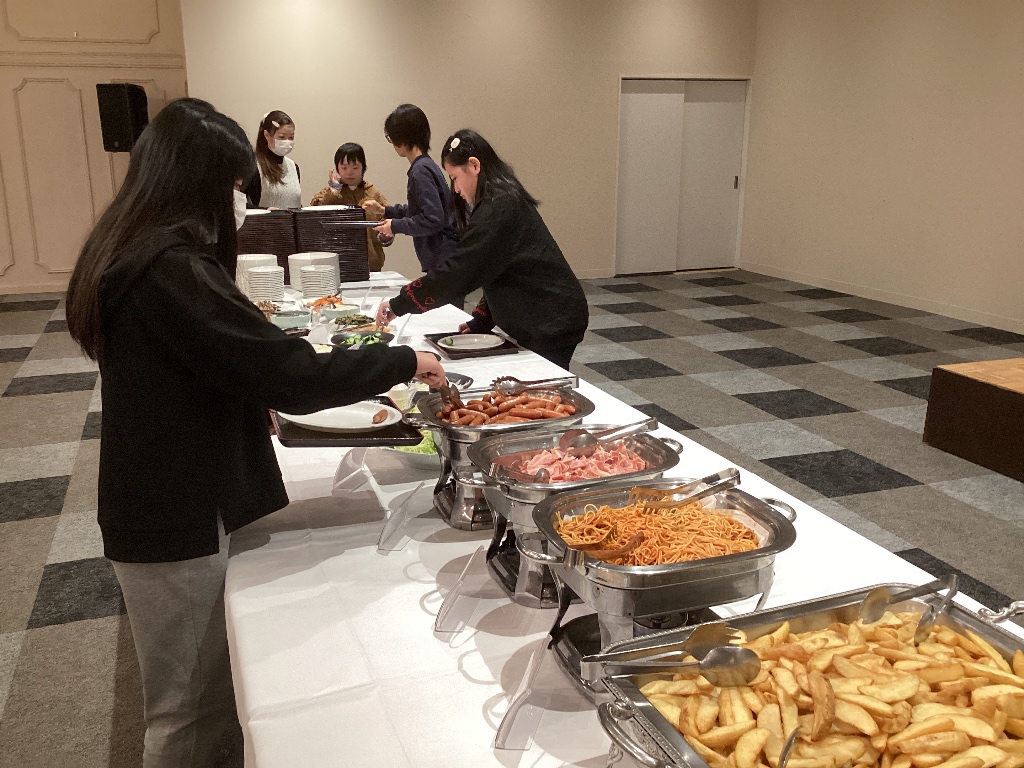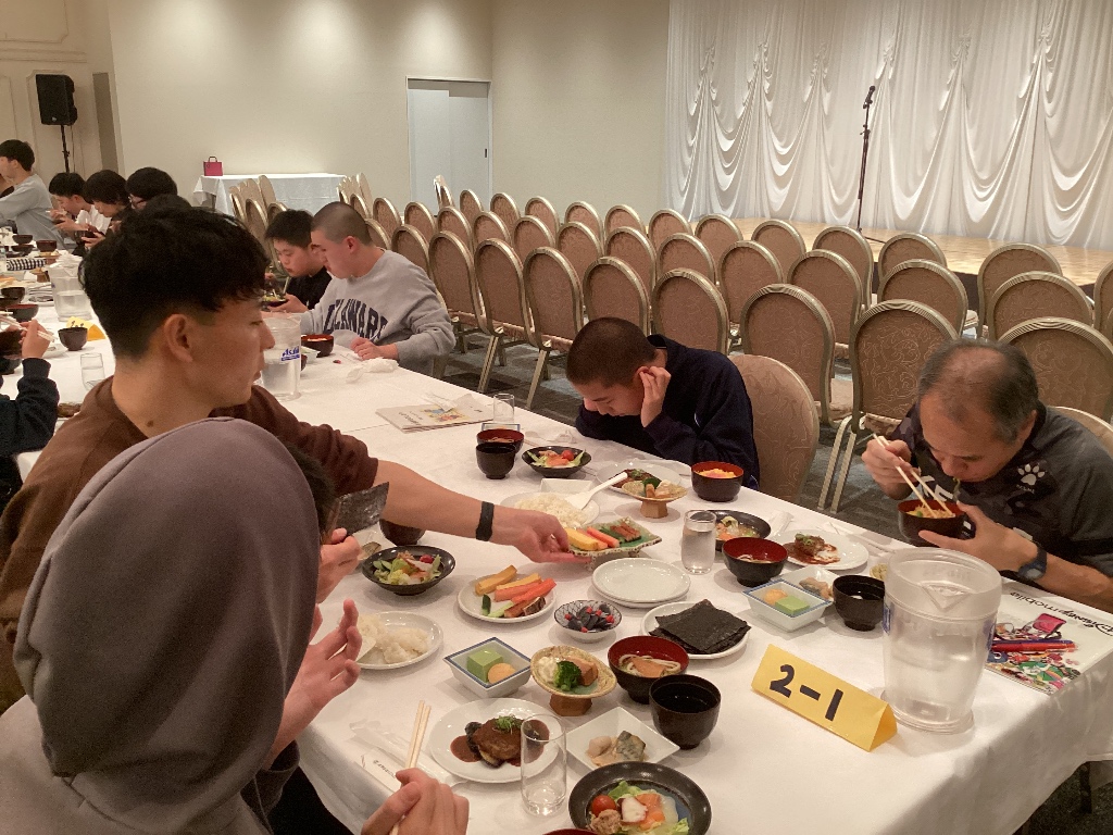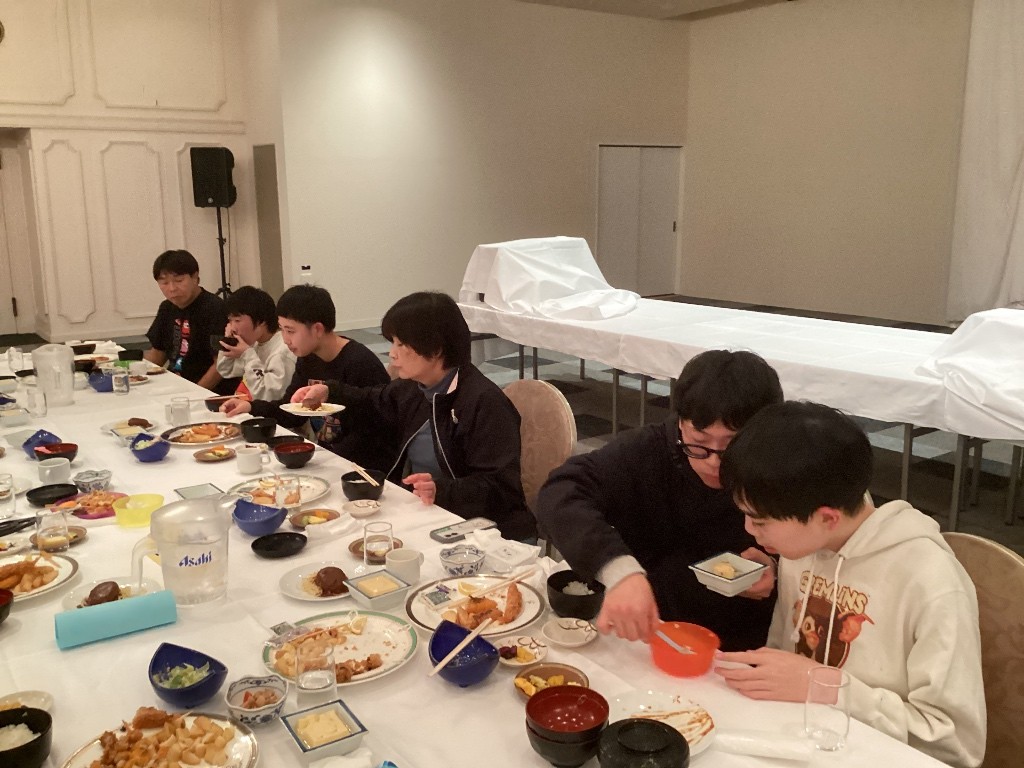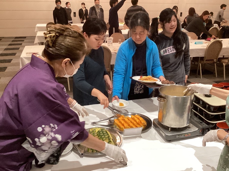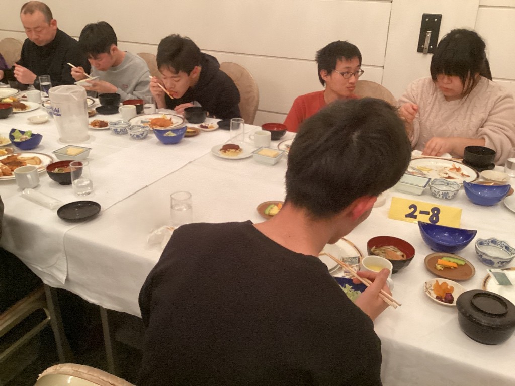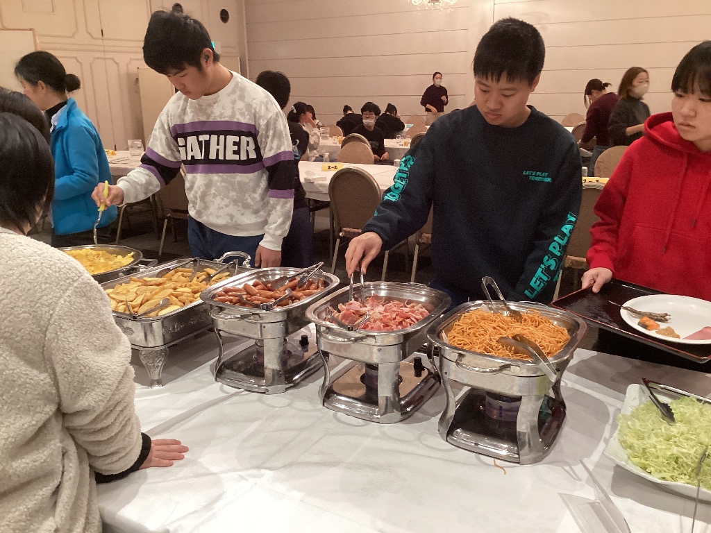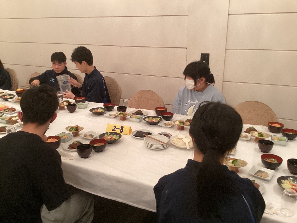 「お寿司(ちらし寿司、手巻き寿司)、ハンバーグ、うどん・・・」といろいろ出てきましたが、 「全部おいしかった」という人がたくさんいました。 関西ならではの出汁がとてもおいしく、「うどんとお吸い物です」という生徒もいました。 おいしくいただき、初日の疲れも吹き飛びました。 |