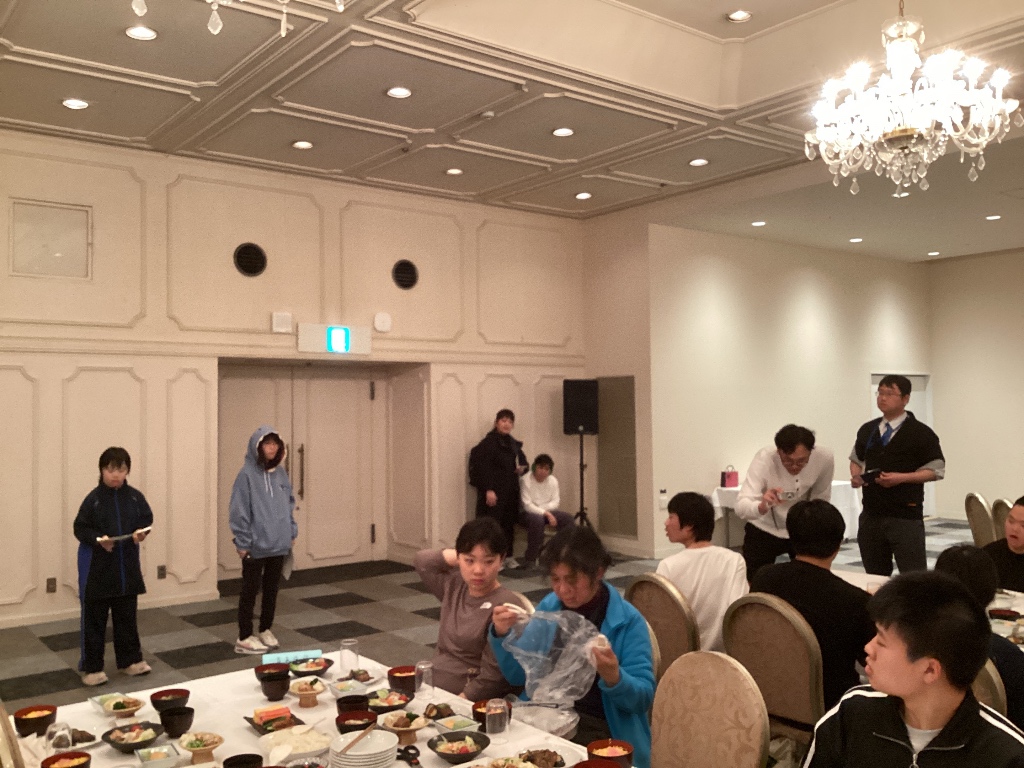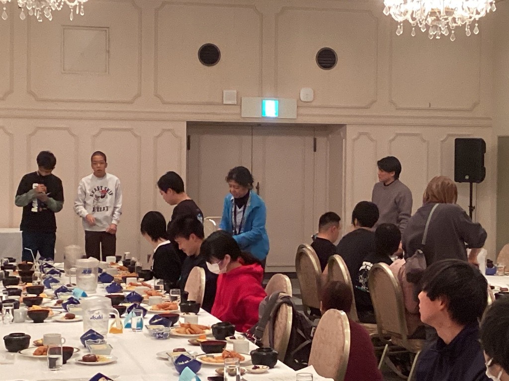 高台にあるホテルに着き、開泊式で三日間お世話になるホテルの方に挨拶をしました。 現在は、入浴タイムです。 |