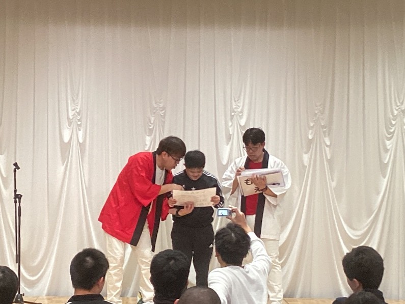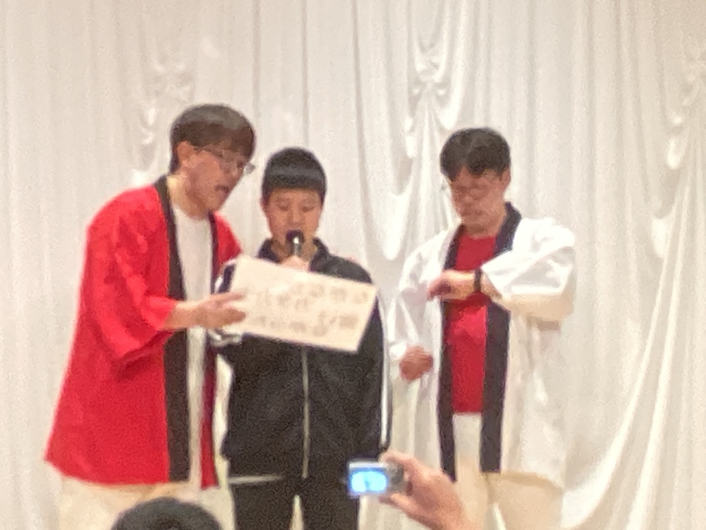 南京玉すだれを使った漫才では、玉すだれの形から「想像力を働かせて」「何に見えるかな」の問いかけに 多くの生徒が答え、お二人とのやり取りを楽しんでいました。 「舞台の上でやってみたい人ー?」の問いかけにも「ハイハイ」と手が上がり、 早口言葉を披露したり、クイズに答えたり、漫才をしてみたり、とても盛り上がりました。 舞台に上がった人は、記念品をいただきました。 |