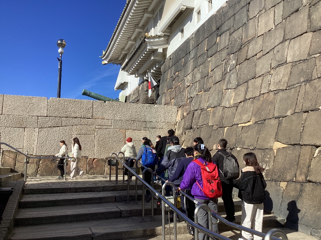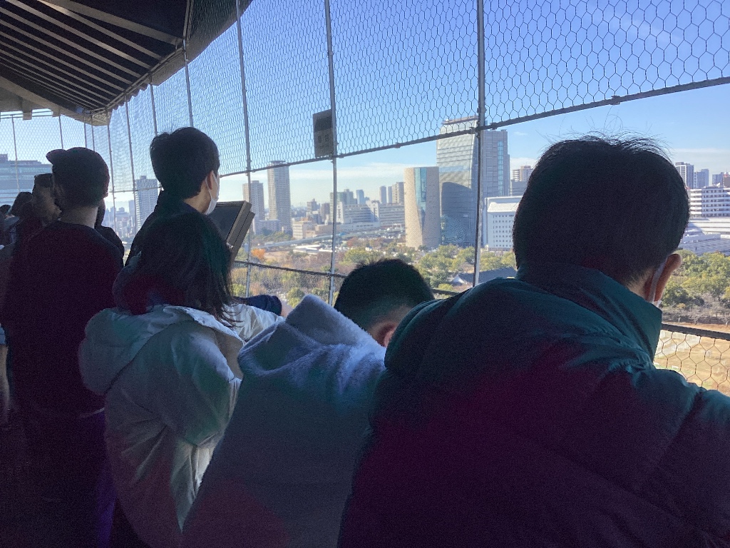 エレベーターで上まで昇り、その後階段で最上階まで行って、大阪の街を眺めました。 天気もよく、青空の下の大阪の街は、いつまでも見ていたくなりましたが、 とても狭く、他の観光客も多く、短い時間で楽しみました。 帰りは、お城の下を散策し、少しタイトなスケジュールとなりましたが、 しっかり見学することができました。 |